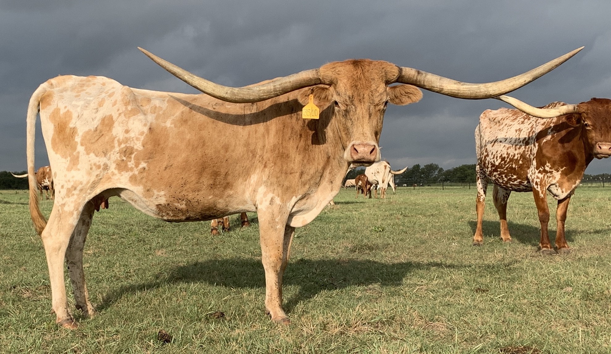 This is a stunning cow that has it all. With her impeccable pedigree and history of producing big horned offspring she will be a knockout for our program. The heifer she just gave us is awesome and we can't wait to breed her to our bull, Jeremiah.